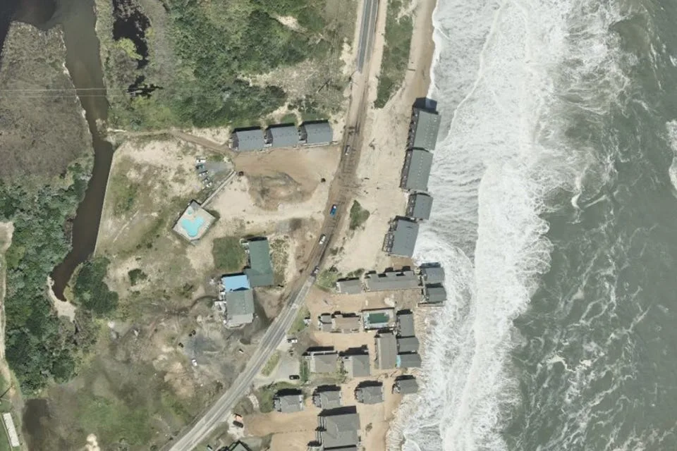 An aerial view from a NOAA Aircraft along Highway 12 on the Outer Banks of North Carolina after Hurricane Erin's high surf surrounds homes on the beach in Buxton.